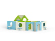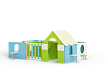 Лабиринт состоит из шести секций (одна из них с крышей) разделенных фанерными ограждениями с круглыми и арочными лазама. Со стороны улицы крепятся столики и ступеньки.